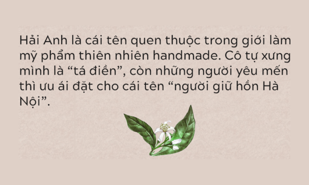 Có lẽ vì thế mà những mùi hương mà Hải Anh làm ra, dù là ở lọ tinh dầu sả chanh, lọ toner hoa sen, lọ nước thơm hoa hoàng lan hay miếng bánh xà phòng mùi già lá tre, luôn khiến người ta bị thu hút và thổn thức bởi một cảm giác ấm áp, bình yên từ thẳm sâu bên trong. Một thứ cảm giác chữa lành.