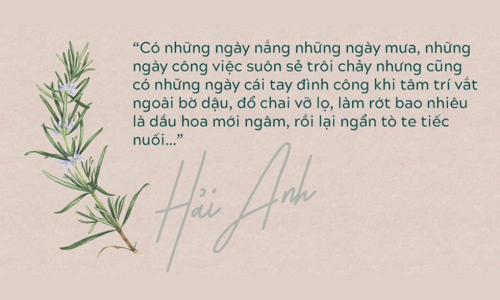 "Thế mà một lần, vì chị gom hoa mang hoa đến xưởng trễ 1 giờ đồng hồ, mà một vị khách quen của em ở Sài Gòn nhắn rằng "mẻ hoàng lan này khác khác". Mùi hương nó biến đổi lạnh lùng lắm. Mà khách lại rất tinh về mùi hương. Nên em không thể nào qua quýt, tuềnh toàng được.", Hải Anh kể câu chuyện để giải thích cho sự cầu toàn của bản thân.
