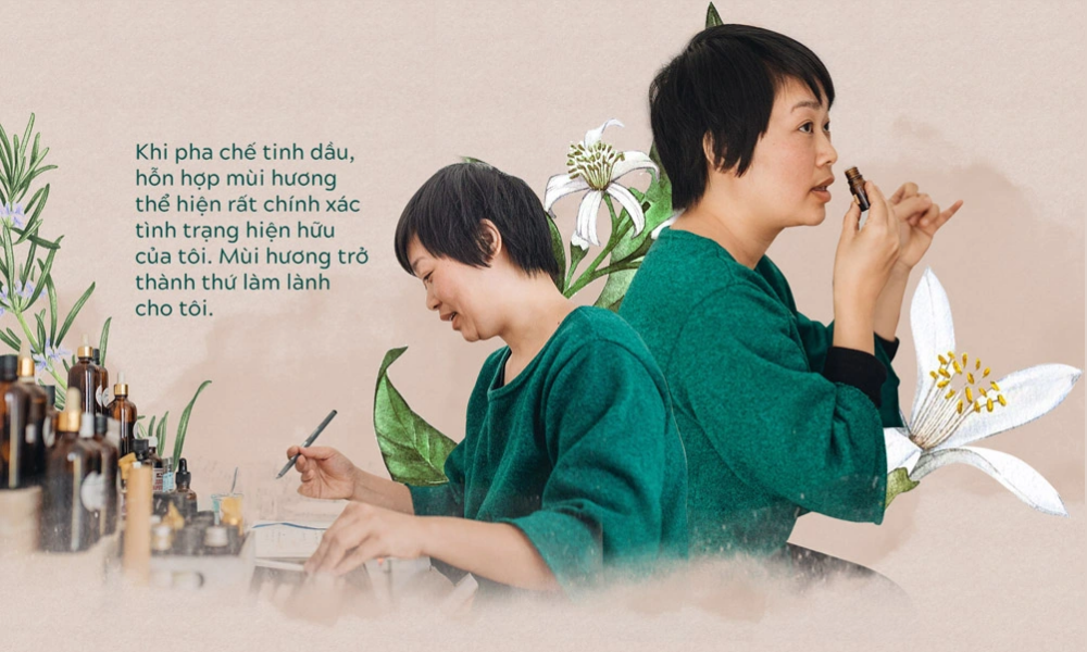"Em mất cân bằng, rất khủng hoảng, em muốn kết nối với bên trong mình. Khi em pha tinh dầu thì nó ra một hỗn hợp rất chính xác với tình trạng hiện hữu của em. Mùi hương trở thành thứ làm lành cho em luôn."