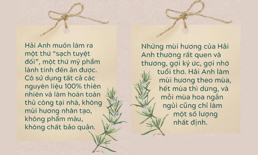 Hơn thế, bao nhiêu năm qua, cô cố thủ cực đoan trong quan niệm giữ tính chất "homemade" cho sản phẩm của mình. Mùa nào thức nấy, nguyên liệu có chừng nào làm chừng đó, không cung ứng theo nhu cầu. Cực đoan tới nỗi, Hải Anh chỉ làm thứ mà cô thấy thích, thứ mà cô thấy phù hợp nhất với chính mình. Cho đến khi tìm thấy tự tính ở mùi hương thì cô cũng bỏ dần những món skincare, chỉ tập trung vào cái mà cô cảm thấy có sự kết nối mãnh liệt.